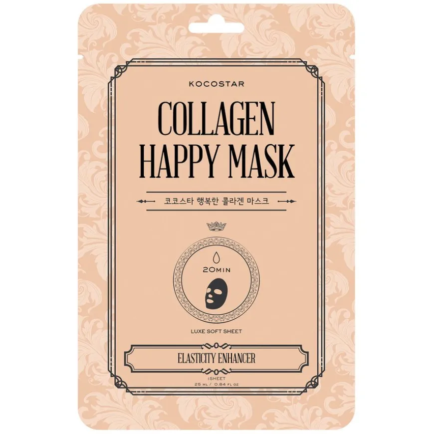 Collagen Happy Mask er en næringsrik sheetmaske som øker hudens naturlige kollagenproduksjon, og får huden til å se og føles mer smidig og ungdommelig ut. Den viktigste ingrediensen er planteekstrakt av kollagen som etterligner kroppens mest abundant protein. Dets rolle er å styrke og støtte huden, samt holde den elastisk. Planteekstrakt av kollagen absorberes raskt i huden og fremmer kollagenproduksjonen samtidig som den gjenoppretter fasthet og elastisitet, samtidig som den tilfører fuktighet til huden. Næringsrik ekstrakt av blæretang og mandelolje forbedrer synligheten av linjer og mykgjør huden. Masken er laget av et mykt og pustende materiale, og den holder seg godt på plass uten å gli nedover ansiktet.