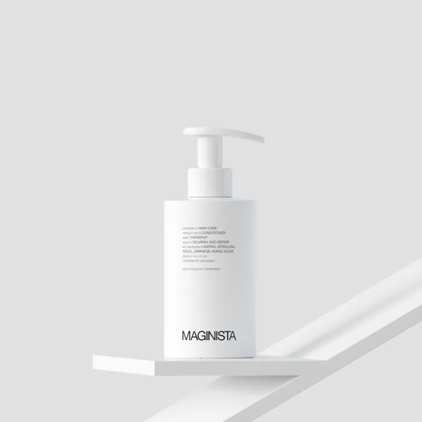 Maginista sin Therapist Conditioner beskytter håret ditt mot hverdagens styling og slitasje. Den unike formelen består av peruviansk maca, spirulina fra Hawaii og hydrolysert keratin. Therapist Conditioner virker ved å trenge dypt inn i hårets cortex og gir forbedret beskyttelse og elastisitet, gjør det lettere å style håret og tilfører fuktighet.