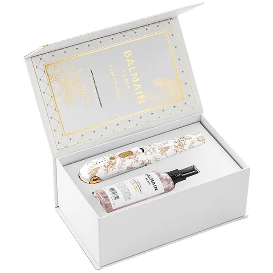 Dette eksklusive settet inkluderer det ikoniske trådløse rettetanget i en ny, raffinert design med gullfargede, blomsterinspirerte detaljer, samt Balmain Thermal Protection Spray, som beskytter håret under varmebehandling.