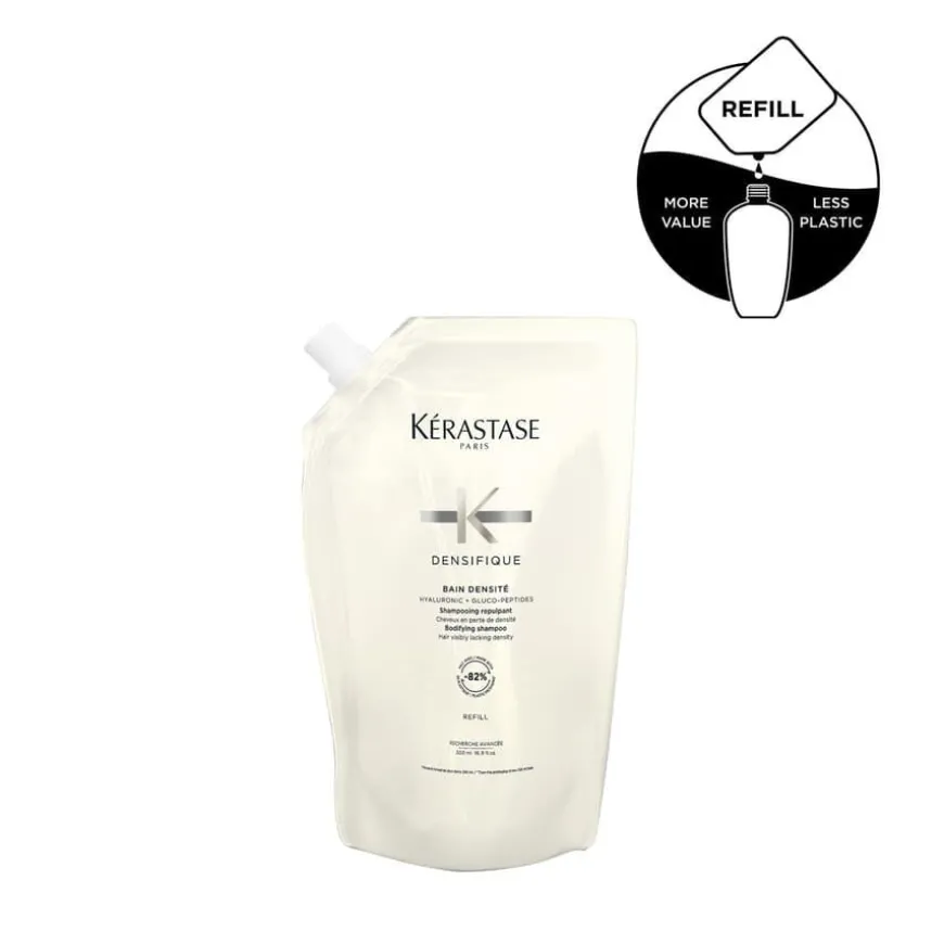 Densifique Bain Densité Shampoo er en shampoo i refill format som gjør håret tykkere, gjenoppretter volum, fylde og spenst for hår som er i ferd med å bli tynt. Refill påsen kan kun brukes sammen med Kérastase sin 500 ml shampooflaske.