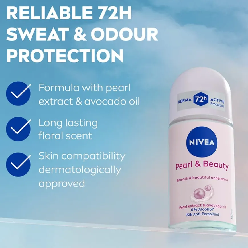 Deo Pearl & Beauty Roll-On er en antiperspirant som gir 72 timers beskyttelse mot svette og lukt, samtidig som den pleier huden og gir myke, glatte armhuler. Den innovative formelen inneholder perleekstrakter, som bidrar til å jevne ut hudtonen, og er beriket med avokadoolje for ekstra pleie. Den delikate blomsterduften gir en varig friskhet, mens den alkoholfrie og dermatologisk testede formelen er skånsom mot huden. Påfør ikke på irritert eller skadet hud.
