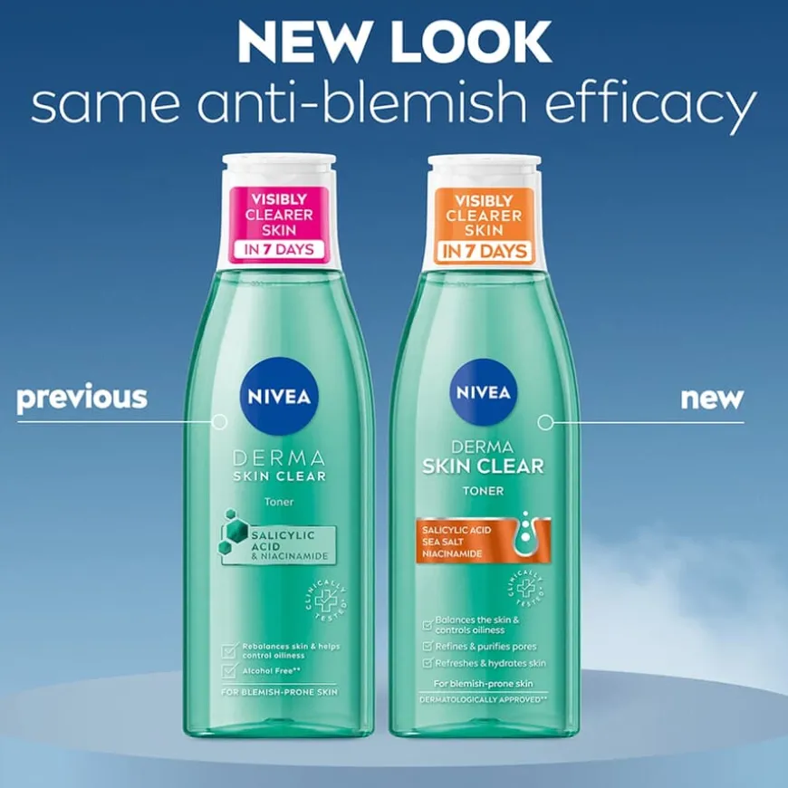 Oppgrader renserutinen og ta kontrollen over akneutsatt hud med NIVEA Derma Skin Clear Toner. Ansiktsvannet balanserer og fukter huden uten å tette porene. Denne NIVEA-toneren gir synlig bedre hud på bare 7 dager. Ansiktstoneren har en formel med salisylsyre og niacinamid som bidrar til å forebygge urenheter og rengjøre fet hud uten å tette porene. Ansiktsrensen er en del av Derma Skin Clear-sortimentet. Bruk denne NIVEA-toneren sammen med hele sortimentet for hvert trinn i hudpleierutinen. Klinisk testet (hudkompatibilitet og effekt på flekker i huden testet i klinisk studie). Vegansk formel – ingen animalske ingredienser. 98 % rPET-flaske (ekskl. lokk og etikett).