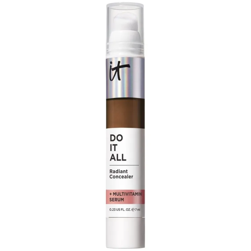 Do It All Plumping Radiant Concealer er en strålende concealer med medium dekning og en pleiende formel som fungerer som et 4-i-1 serum. Den skjuler ujevnheter, fyller ut fine linjer og gir huden glød uten å legge seg i linjene. Inneholder et multivitaminserum med hyaluronsyre, niacinamid, vitamin B5 og vitamin E som gir fuktighet i opptil 24 timer, forbedrer hudens tekstur og utstråling. Concealeren har en lett konsistens og en myk applikator som gjør det enkelt å kontrollere dekningen. Passer alle hudtyper, inkludert tørr og kombinert hud. Vegansk formel og dermatologisk testet.