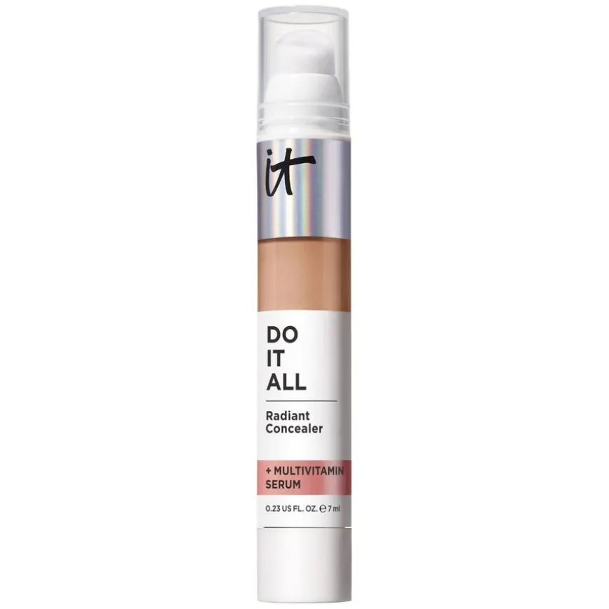 Do It All Plumping Radiant Concealer er en strålende concealer med medium dekning og en pleiende formel som fungerer som et 4-i-1 serum. Den skjuler ujevnheter, fyller ut fine linjer og gir huden glød uten å legge seg i linjene. Inneholder et multivitaminserum med hyaluronsyre, niacinamid, vitamin B5 og vitamin E som gir fuktighet i opptil 24 timer, forbedrer hudens tekstur og utstråling. Concealeren har en lett konsistens og en myk applikator som gjør det enkelt å kontrollere dekningen. Passer alle hudtyper, inkludert tørr og kombinert hud. Vegansk formel og dermatologisk testet.