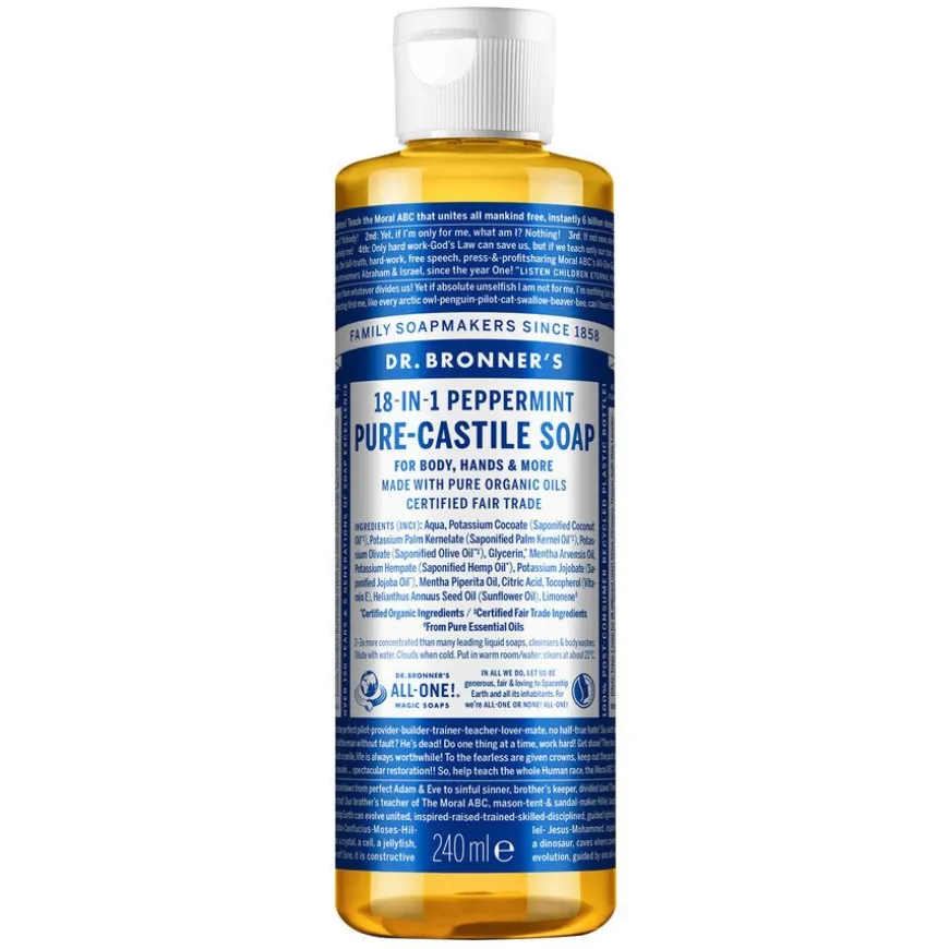 18-In-1 Peppermint Pure Castile Soap er en duftende såpe med økologisk peppermynte og eterisk olje for å kjøle ned huden, åpne bihulene og skjerpe sinnet. Denne såpen er konsentrert, allsidig og effektiv. Laget med økologiske og sertifiserte fair trade ingredienser.