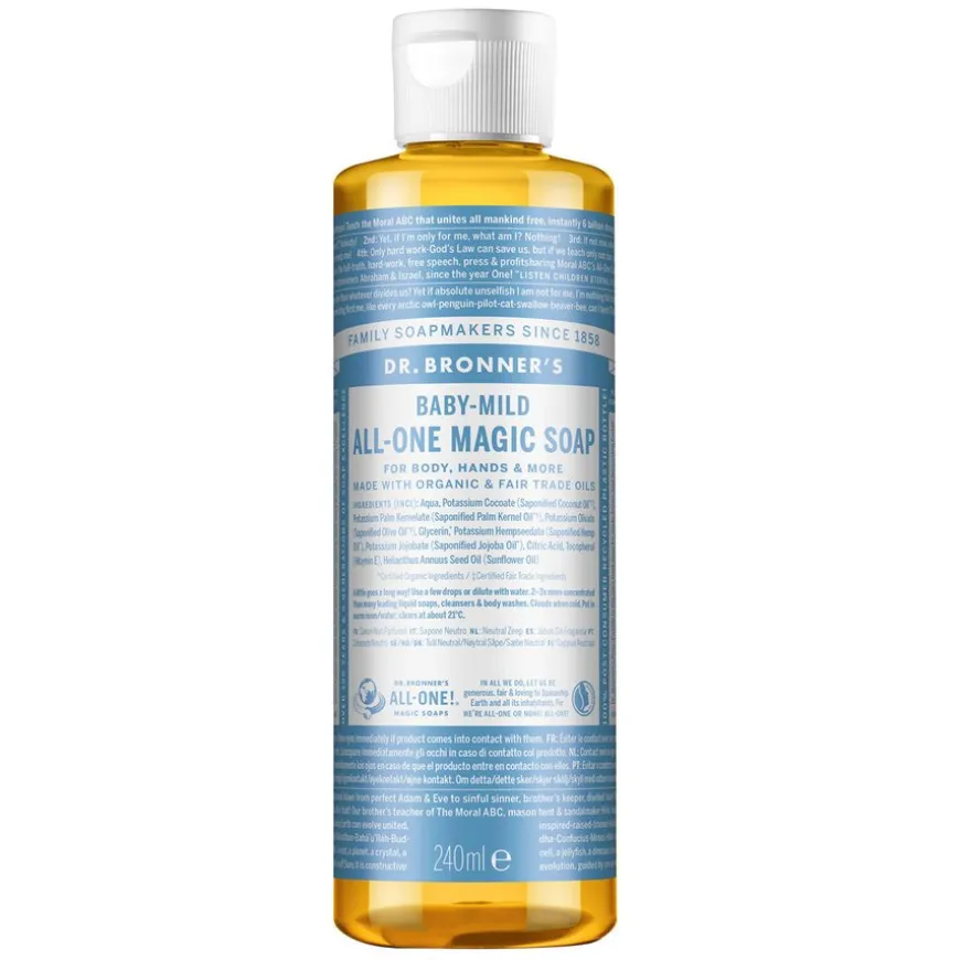 18-In-1 Unscented Baby Mild Pure Castile Soap er en vegansk allsidig såpe laget av naturlige økologiske oljer fra kokos, oliven, palme kjernen, hamp og jojobaoljer. Uten tilsatt duft og dobbelt så mye olivenolje, er Castile Liquid Soap Baby Mild Unscented egnet for sensitiv hud og babyer. De ulike oljene skaper en unik såpe som rengjør effektivt, produserer et fløyelsaktig skum som etterlater huden silkeglatt og oppfrisket. Denne allsidige såpen kan brukes til ansiktet, hendene, hele kroppen og håret. I tillegg kan den brukes utblandet til rengjøring av hjemmet, som gulv og kjøkkenbenker, og som oppvaskmiddel. Rengjør huset og kroppen din uten syntetiske konserveringsmidler, vaskemidler eller skummiddel.