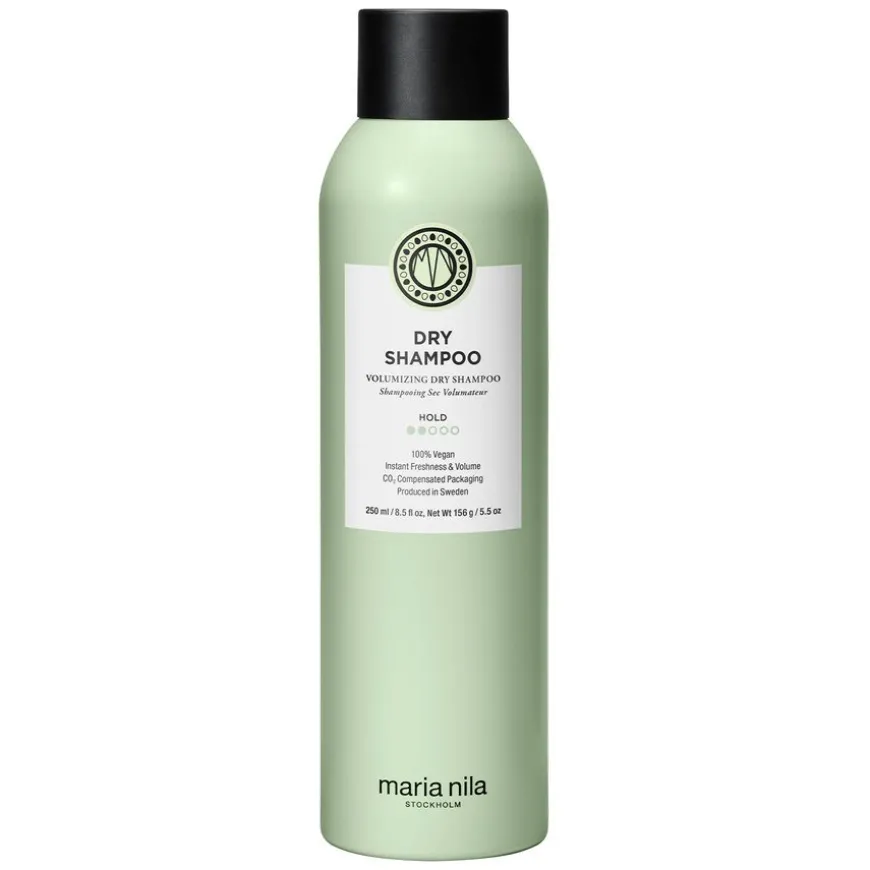 Dry Shampoo er en pudderspray/tørrshampoo som umiddelbart frisker opp fett hår og fjerner opphopning mellom vaskene. Den kan også brukes som et stylingprodukt for å legge til volum og skape en grovere tekstur som gjør at spenner og bobbynåler fester seg bedre til håret ved styling. Tørrshampooen har en unik fruktig duft av pære. Color Guard Complex bidrar til å bevare fargen ved å beskytte håret mot UV-stråling og frie radikaler. Sammenlignet med Maria Nila Invisidry Shampoo, har tørrsjampoen et sterkere hold, tilfører mer volum og tekstur til håret.