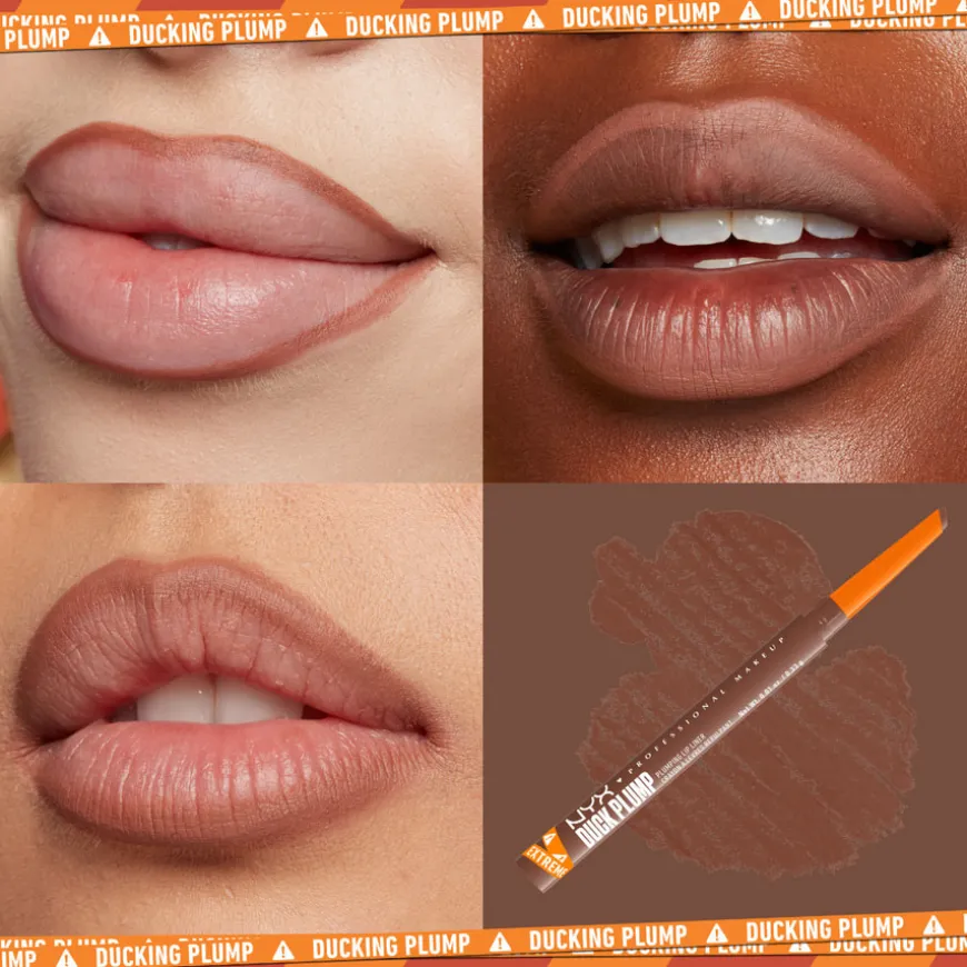 NYX Professional Makeup Duck Plump Lip Liner med skrå spiss for enkel påføring hver gang. Marker leppenes konturer med den spisse enden og fyll deretter inn med den flate enden for å gi leppene dine en perfekt form. Du kan skape akkurat den formen du selv vil ha på leppene. Det er ikke vanskelig! Leppeblyanten gir leppene et fyldigere utseende og fremhever leppenes naturlige form. Formelen er beriket med ingefær og chili akkurat som den populære Duck Plump High Pigment Plumping Gloss.