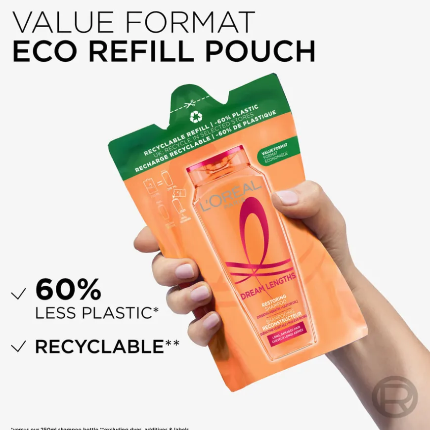 Resirkulerbar refillpose som er fremstilt av 60 % mindre plast enn en 250 ml shampooflaske.