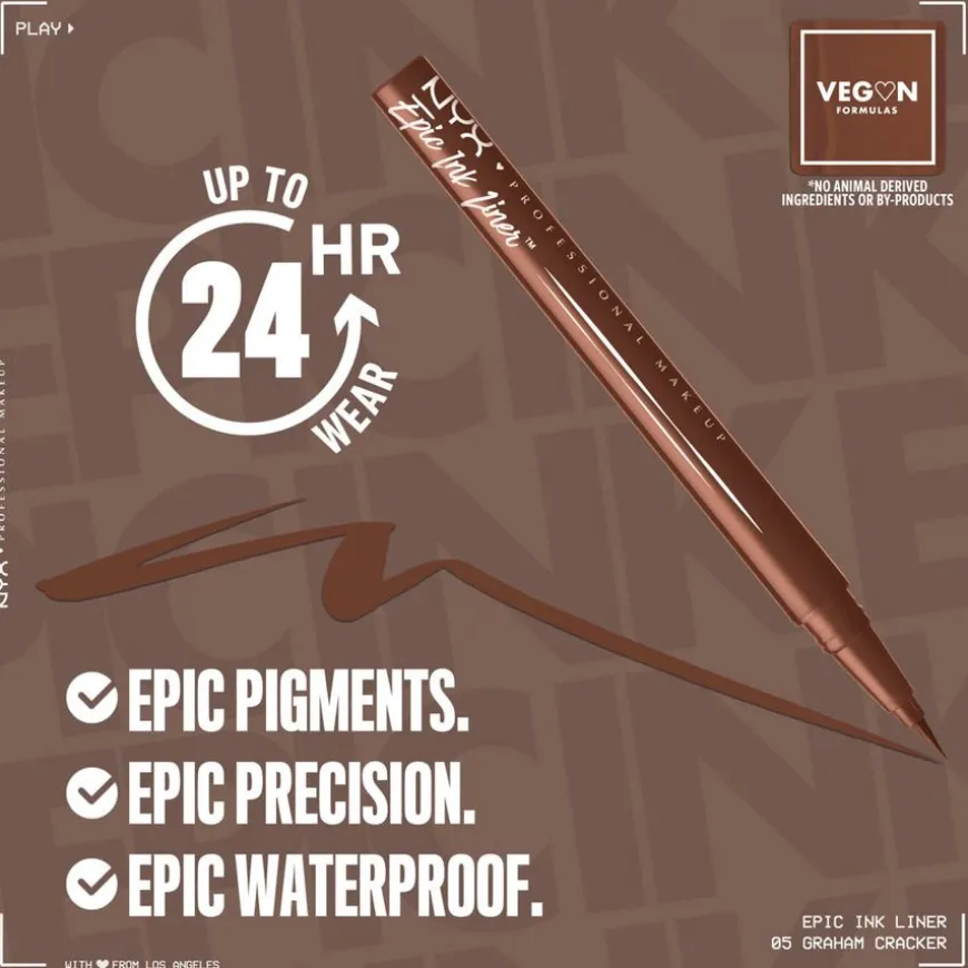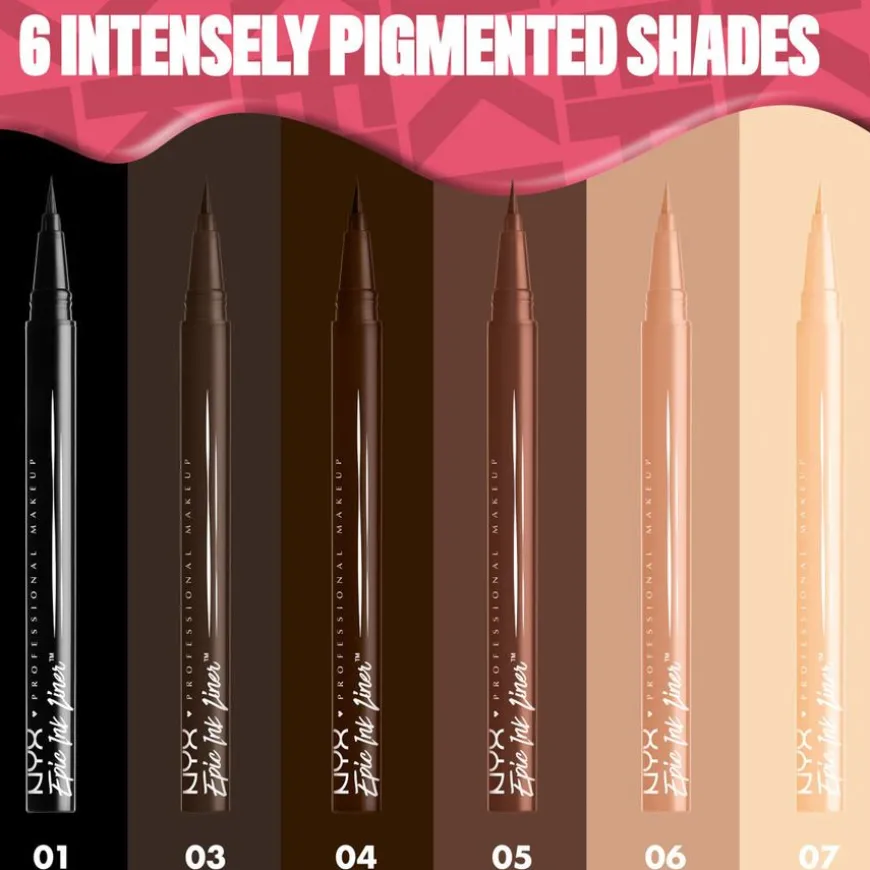 Epic Ink er en flytende eyeliner som gir episk presisjon, episk hold, episk kunst. NYX Professional Makeups flytende, vannfaste eyeliner med filtspiss gjør det enkelt å tegne ultrapresise linjer. Formelen med intense pigmenter glir enkelt på huden, slik at du får supermettede linjer som holder lenge. Den tynne og fleksible tuppen gjør det enkelt å skape både tynne og tykke streker. Enten du vil ha nesten usynlige linjer eller en klassisk cat-eye look sørger denne vannfaste, flytende eyelineren for episke resultater. Fås i flere forskjellige intenst pigmenterte nyanser.