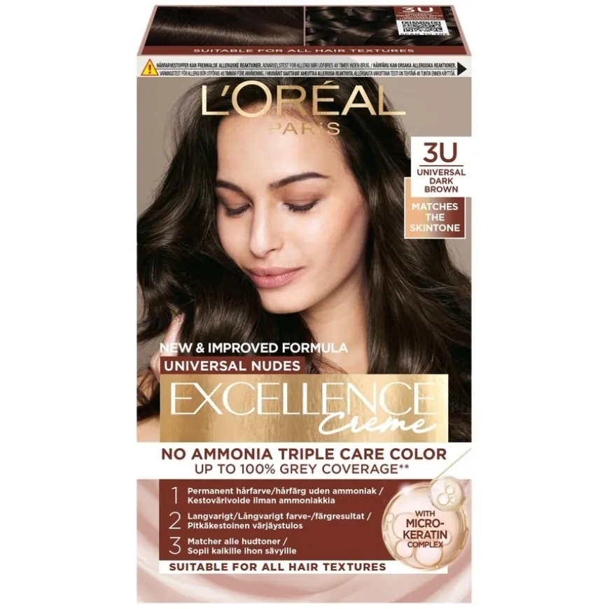 L’Oréal Paris Excellence Universal Nudes er en permanent hårfarge uten ammoniakk til alle hårtyper. Nyansene er utviklet for å passe til alle hudtoner og dekker grå hår opptil 100 %. Formelen gir håret næring og glans**.