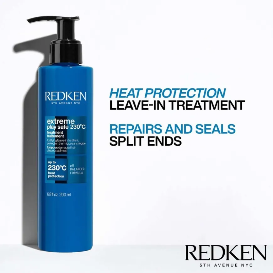 Redken Extreme Play Safe er en leave-in-behandling, som beskytter håret mot varme opptil 230°C, samtidig som den reparerer splittede spisser. Dette produktet passer for alle som ofte bruker varme til å style håret sitt. Det er en allsidig behandling, som reparerer splittede spisser ved å forsegle dem, hvilket reduserer synligheten av splittede spisser.Den behandler overflateskader, forsterker håret innenfra og forebygger splittede spisser og beskygger mot varmen fra varmeverktøy som rettetang, krølltang og hårføner.