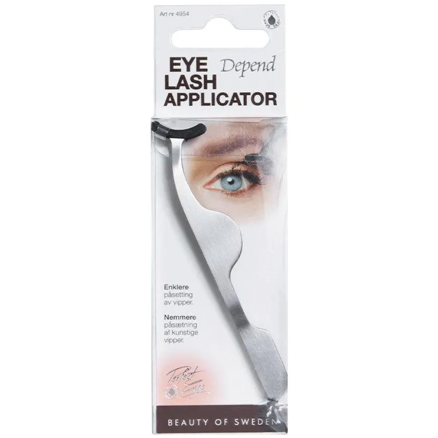 Depend Eyelash Applicator i rustfritt stål er spesiallaget for å forenkle påsetting av løsvipper. Den er utformet som pinsett med bredere gripeoverflate i gummi som beskytter vippens struktur mot skadet. I motsatt ende av applikatoren er en spiss gummipute som kan brukes til å trykke vippene fast mot øyelokket.