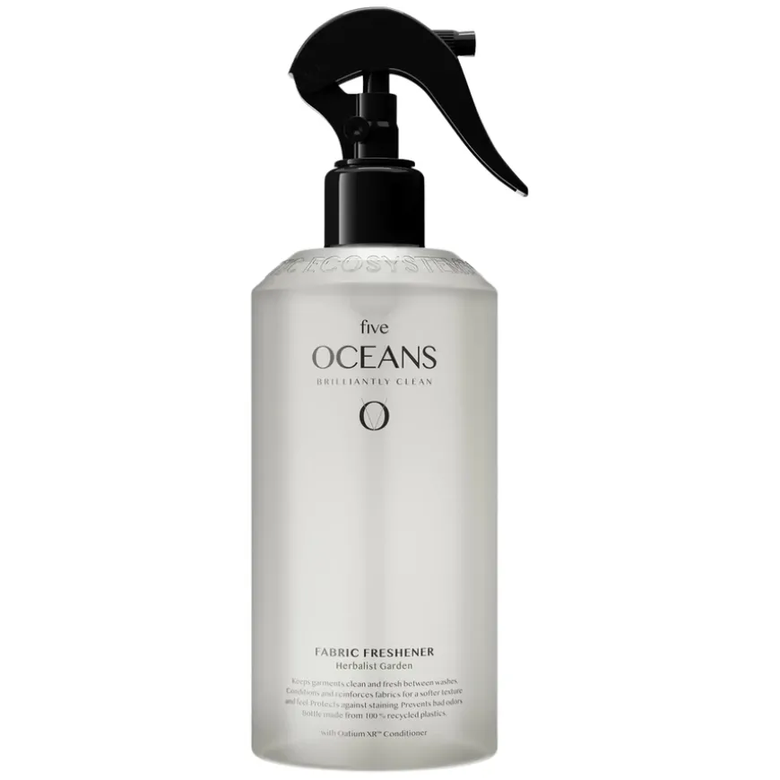 Fabric Refreshener Herbalist Garden fra Five Oceans er en tekstilspray som gjør det enkelt å friske opp klær, sko, møbler og andre tekstiler mellom vask. Den antibakterielle formelen gir en umiddelbar og langvarig luktregulerende effekt, samtidig som den biobaserte flekkbeskytteren gjør det lettere å fjerne flekker og søl. Sprayen styrker tekstilfibrene og gir en myk, nyvasket følelse, samtidig som den forlenger plaggets levetid. Duften er en harmonisk blanding av friske grønne urter, te, rose og musk – en balansert kombinasjon som både virker oppkvikkende og beroligende. Sprayen reduserer behovet for hyppig vask og er både vegansk og miljøvennlig. Flasken er laget av 100 % resirkulert plast.