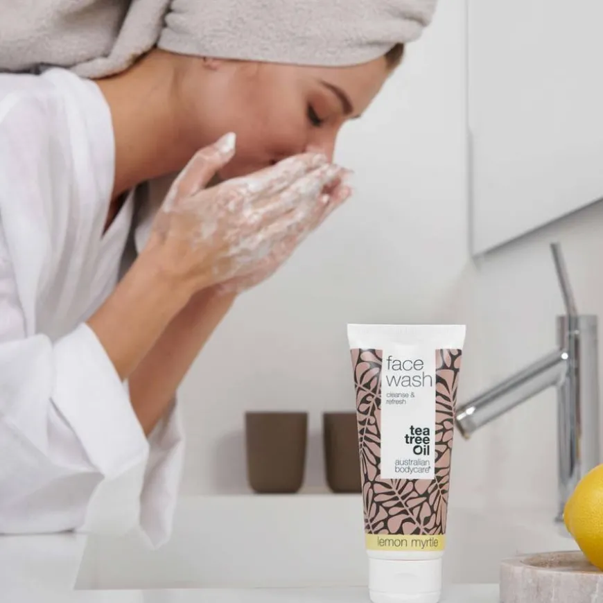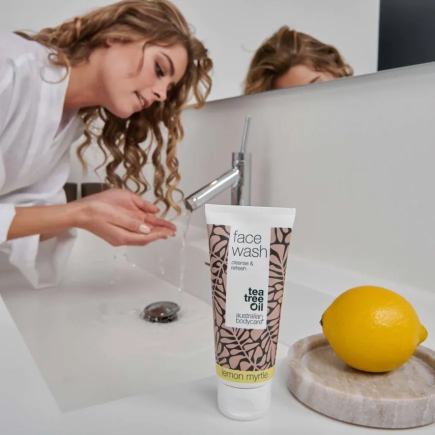 Face Wash Lemon Myrtle er en ansiktsrens fra Australian Bodycare som er effektiv mot hudormer, kviser og uren hud i ansiktet. Den renser i dybden og gjenoppretter den sunne balanse, så urenheter motvirkes og forebygges. Ansiktsrensen inneholder 100 % naturlig tetreolje fra Australia, og er effektiv mot hudormer, kviser og uren hud i ansiktet. Face Wash er dermatologisk testet og kan brukes av alle hudtyper. Face Wash er spesielt god til fet hud, siden produktet effektivt vasker vekk overflødig talg og skitt fra huden.