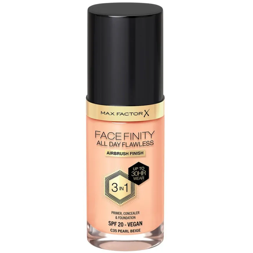 Facefinity All Day Flawless 3-In-1 Foundation er en 3-i-1 flytende foundation som også fungerer som ansiktsprimer og concealer for å tilby opptil 30 timers bruk som varer hele dagen. For en feilfri, langvarig look, er det Max Factor Facefinity All Day Flawless Foundation nå med Climate Proof Protection. Den lette og pustende veganske formelen gir fantastisk dekkevne som skjuler rødhet og ufullkommenhet.