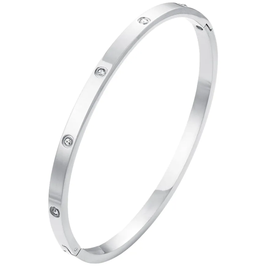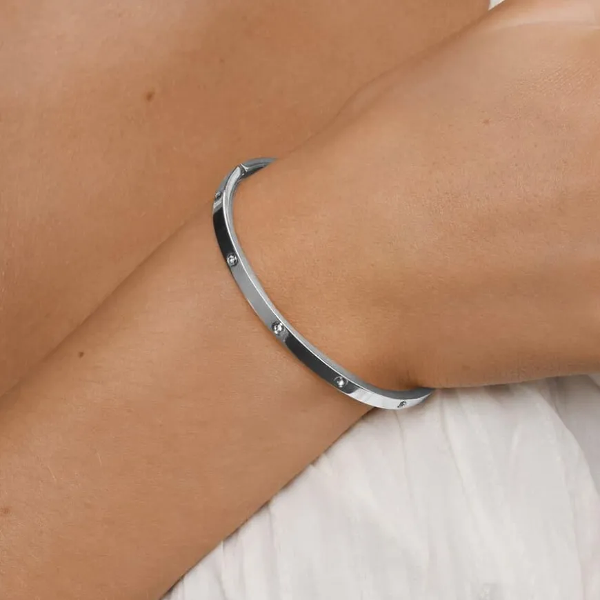 Fiona Crystal Bangle Bracelet Silver tilfører en perfekt mengde glitter til enhver anledning. Dette elegante armbåndet er laget av slitesterkt rustfritt stål og prydet med glitrende krystaller, noe som gir en sofistikert og tidløs look. Perfekt for både hverdagsbruk og spesielle anledninger. Vannbestandig og designet for å vare, slik at du kan skinne uten bekymringer. Laget av Happy People og fri for nikkel, kadmium og bly.