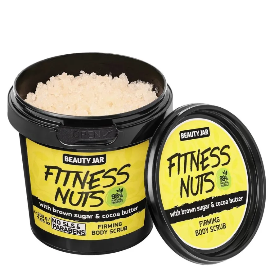Fitness Nuts Body Scrub inneholder naturlig rørsukker som eksfolierer og glatter ut huden etter trening, samtidig som det bevarer sine naturlige egenskaper. Kakaosmør, rikt på fettsyrer og antioksidanter, gir næring og fuktighet til huden, slik at den føles så god at du kanskje ikke engang trenger krem etterpå.