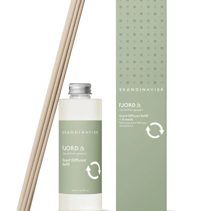 Skandinavisk FJORD Scent Diffuser kombinerer skandinaviske duftfortellinger med vegetabilske oljer fra fornybare kilder, pakket i en resirkulert plastflaske (rPET), for opptil 3 ekstra måneder med skånsom og bærekraftig romduft.