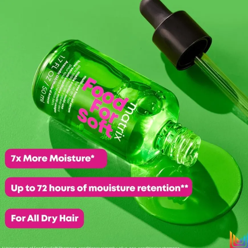 Matrix Food For Soft Multi-Use Hair Oil Serum er en leave-in behandling beriket med nærende avokado-olje, utviklet for å forsegle fuktigheten i håret og gjøre det glansfullt, glatt og mykt. Serumet er en del av Matrix’ fuktighetsgivende pleiesystem og bidrar til å forhindre fuktighetstap, samtidig som det etterlater håret dypt hydrert i opptil 72 timer.