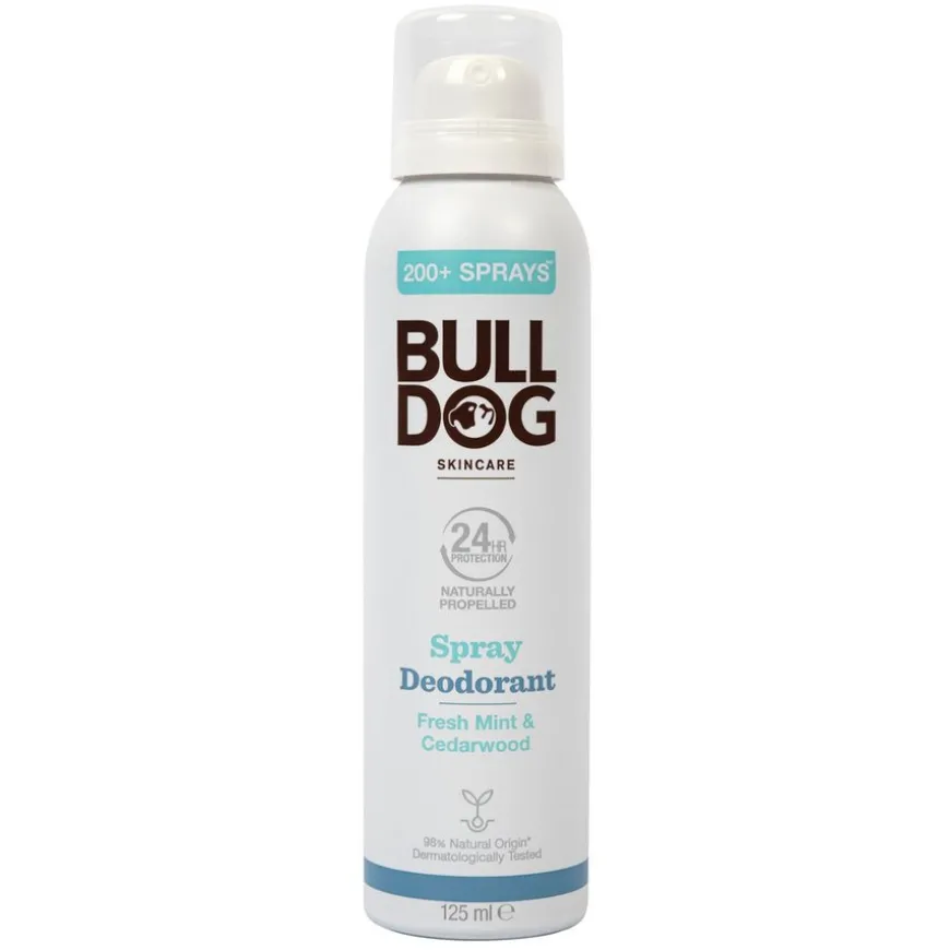 Bulldog Fresh Mint & Cedarwood Spray Deodorant er en spraydeodorant for menn som er utviklet for å gi 24-timers beskyttelse mot ubehagelig lukt. Deodoranten har en frisk duft av naturlige ingredienser med oppfriskende toner av peppermynte, bergmynte og rosmarin, supplert med patchouli og sedertre. Den kombinerer det beste fra naturen og vitenskapen for en unik duftteknologi med beskyttelse mot ubehagelig lukt og en friskhet som varer lenge. Passer også sensitiv hud.
