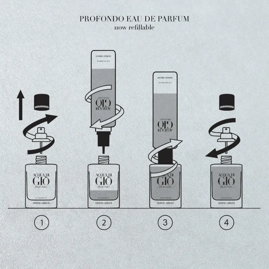 Acqua di Giò Profondo Parfum fanger den vanedannende og intense tiltrekningen til havets ukjente dybder. Duften formidler en følelse av dyp friskhet og opplevelsen av å omgi seg med havets mysterier. Flaskens spennende innhold fremkaller en tett, harpiksaktig og mineralsk fasett av Acqua di Giò. Disse notene er laget rundt bergamottnoter, balsamisk cistus-absolutt og rikheten av evigvarende essens, og gir Acqua di Giò rofondo Parfumsin dybde og intensitet. Duften minner om havets uendelighet og presenteres i en dypblå flaske, med en tone som går fra dyp blå øverst til gjennomsiktig turkis nederst. Flasken er designet med en elegant metallisk blå kork, med en sølvfarget aksent under.