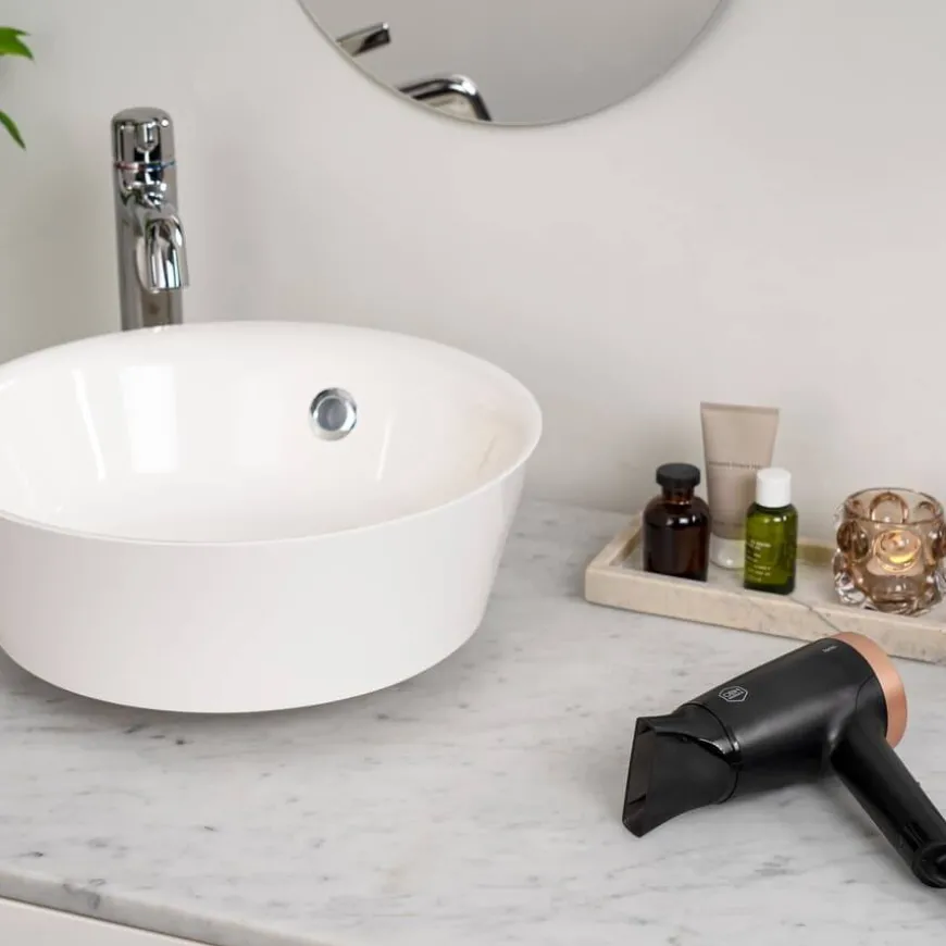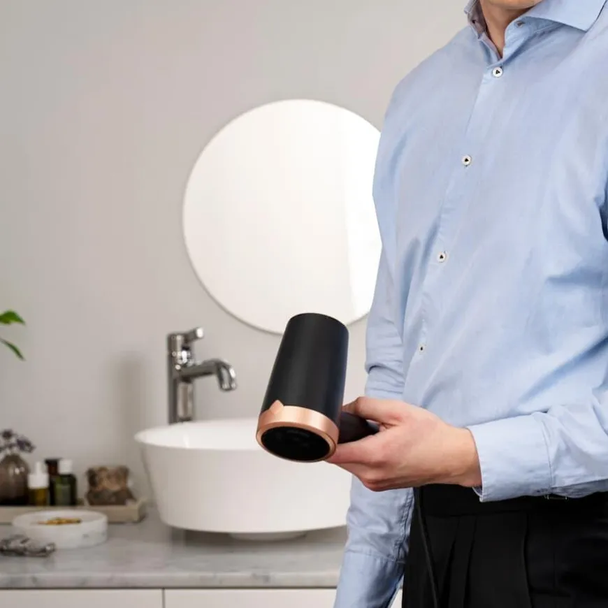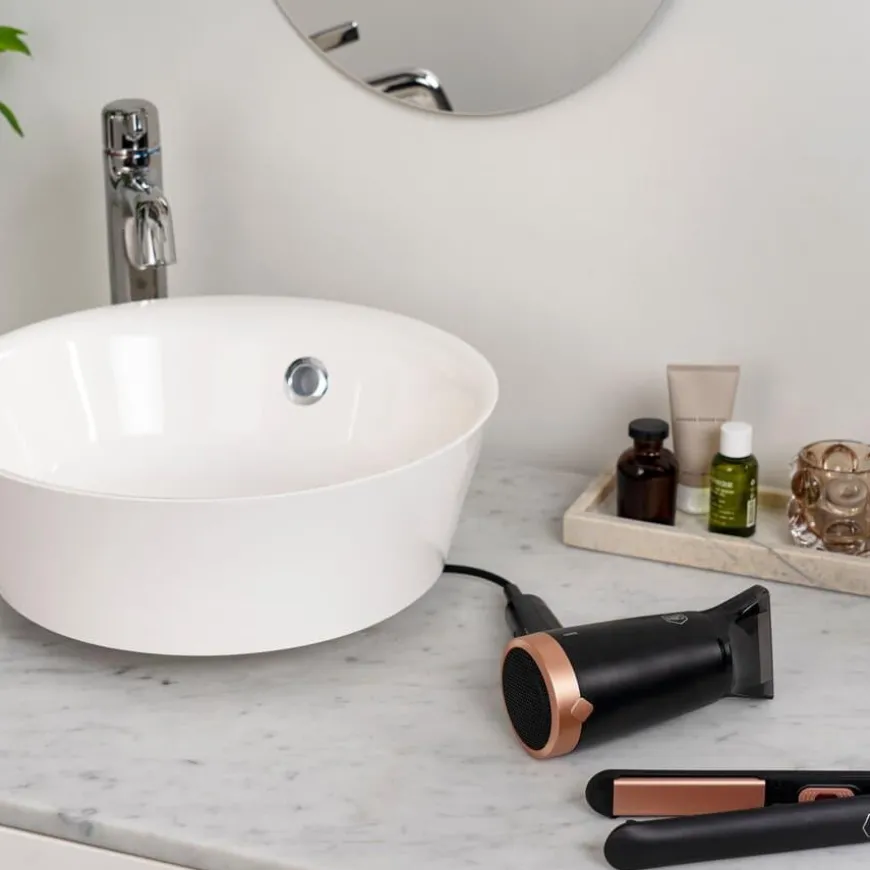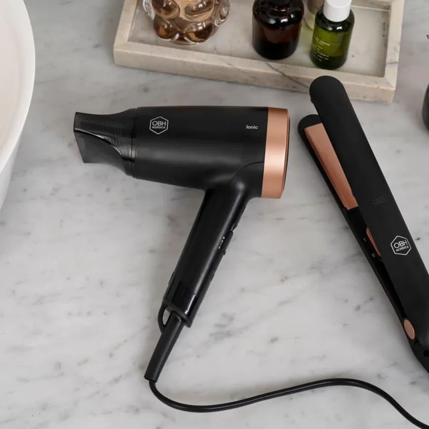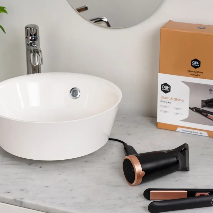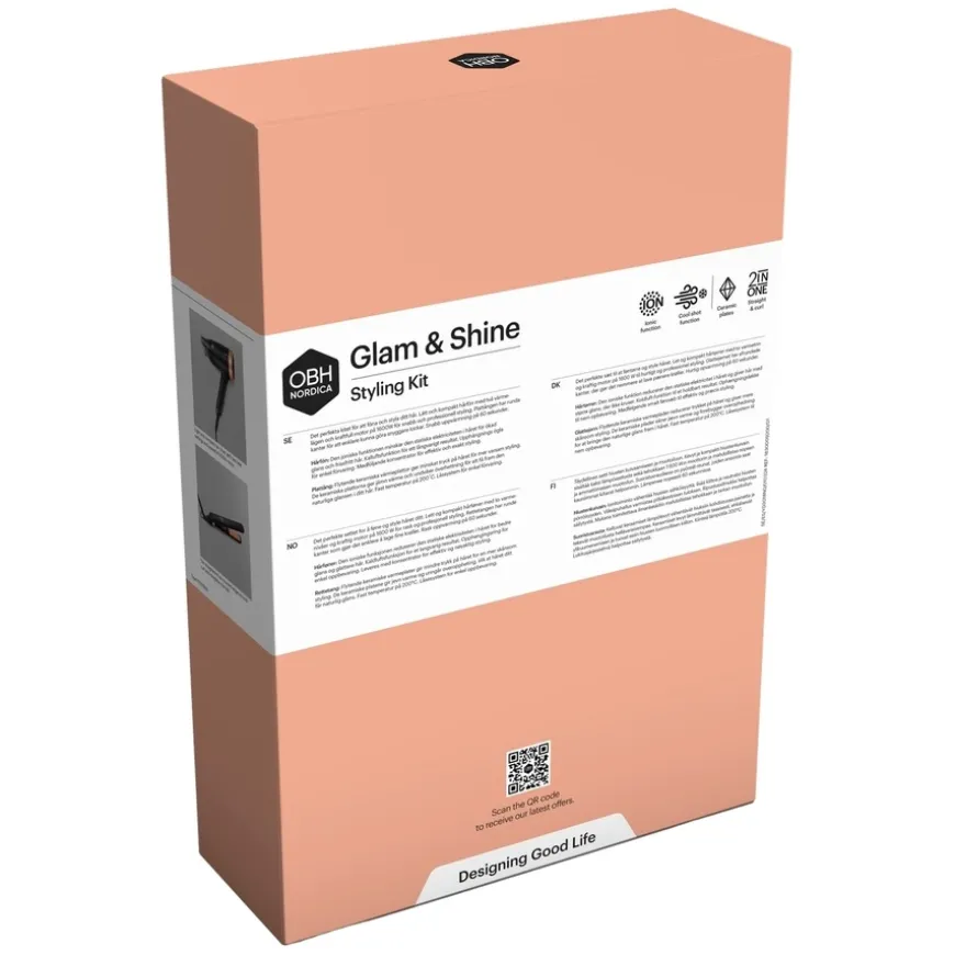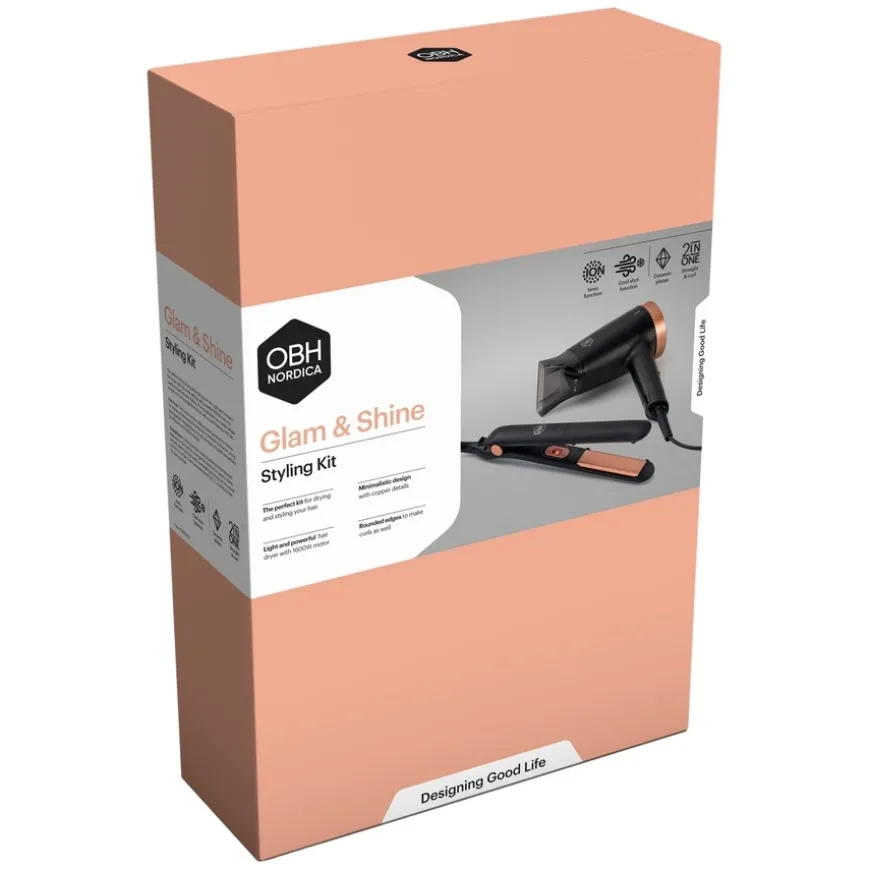 Glam & Shine Styling Kit er et komplett sett for deg som vil føne og style håret enkelt og effektivt, både hjemme og på farten. Settet består av en hårføner og en rettetang – begge i kompakt format med lav vekt og et elegant design med kobberdetaljer. Hårføneren har en kraftig 1600 W motor, to varmenivåer og en kaldluftfunksjon som bidrar til å fiksere frisyren. Den inneholder ioniseringsteknologi som reduserer statisk elektrisitet og gir håret mer glans og mindre frizz. Rettetangen varmes opp på ca. ett minutt og har keramiske plater med avrundede kanter for enkel og skånsom styling av både rette frisyrer og krøller. Med en fast temperatur på 200 °C og låsefunksjon er den ideell til både bruk og oppbevaring. Perfekt stylingverktøy for alle hårtyper.