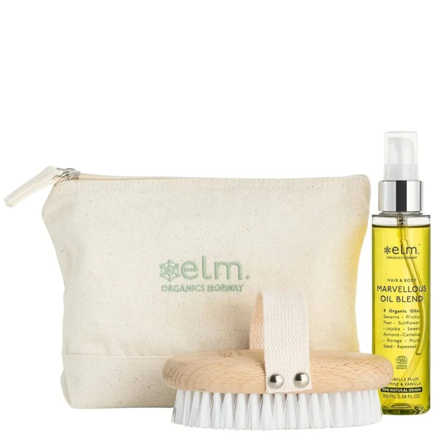 Glowing Body Kit fra Elm Organics inneholder alt du trenger for en nærende og revitaliserende kroppspleierutine. Settet inkluderer bestselgeren Marvellous Oil Blend og en vegansk Body Brush som sammen gir huden optimal fuktighet, glød og forbedret tekstur. Body Brush eksfolierer skånsomt, stimulerer blodsirkulasjon og forbereder huden for bedre absorpsjon av olje. Marvellous Oil Blend tilfører intensiv næring og etterlater huden silkemyk, smidig og glødende. Dette eksklusive settet er perfekt for deg som ønsker en luksuriøs velværeopplevelse hjemme.