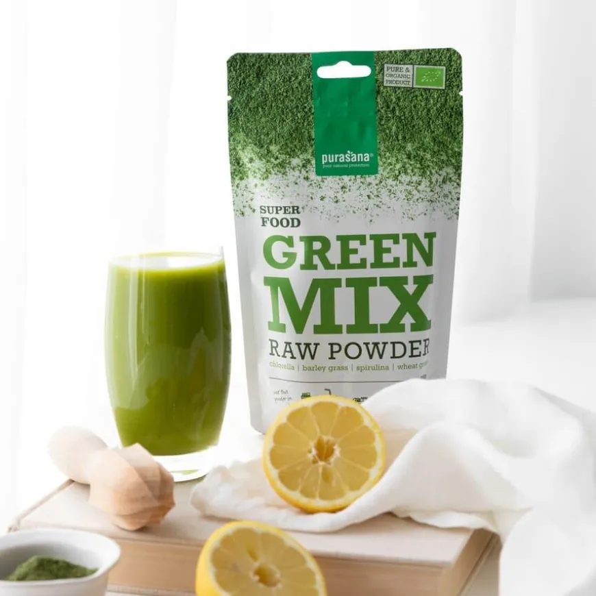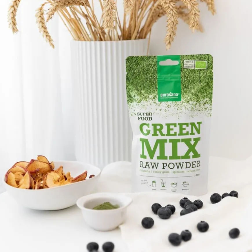 Purasana Green Mix Powder er en nøye sammensatt blanding av chlorella, spirulina, hvetegress og byggress – fire kraftfulle supermat-ingredienser kjent for sine ernæringsmessige egenskaper. Denne naturlige blandingen er rik på folsyre, selen, jern og vitamin B12, essensielle næringsstoffer som bidrar til energi, vitalitet og generell velvære.