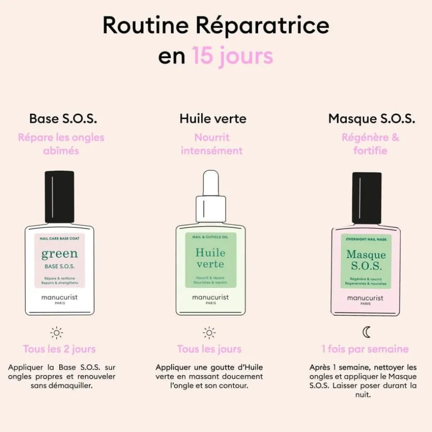 Base Coat Base S.O.S.: ETHYL ACETATE, BUTYL ACETATE, NITROCELLULOSE, ADIPIC ACID/NEOPENTYL GLYCOL/TRIMELLITIC ANHYDRIDE COPOLYMER, ACETYL TRIBUTYL CITRATE, ALCOHOL, SUCROSE ACETATE ISOBUTYRATE, HEA IPDI ISOCYANURATE TRIMER/POLYCAPROLACTONE DIOL COPOLYMER, GLYCOLIC ACID, TRIS-HEA ISOCYANURATE TRIMER, N-BUTYL ALCOHOL, ISOPROPYL ALCOHOL, ETOCRYLENE, MALIC ACID, LACTIC ACID, HEXANAL, TRIMETHYLPENTANEDIYL DIBENZOATE, AQUA (WATER), PANTHENOL, MAGNESIUM ASCORBYL PHOSPHATE, CI 60725 (VIOLET 2), TOCOPHEROLManucurist Green Overnight Nail Masque S.O.S.: AQUA (WATER), ALCOHOL DENAT., POLYVINYL ALCOHOL, PANTHENOL, PARFUM (FRAGRANCE), ALCOHOL, TRIS(TETRAMETHYLHYDROXYPIPERIDINOL) CITRATE, CI 14700 (RED 4)Manucurist Nail & Cuticle Oil: PRUNUS AMYGDALUS DULCIS (SWEET ALMOND) OIL, PASSIFLORA EDULIS SEED OIL, ADANSONIA DIGITATA SEED OIL, JUGLANS REGIA (WALNUT) SEED OIL, ALEURITES MOLUCCANUS SEED OIL, COCOS NUCIFERA (COCONUT) OIL, TOCOPHERYL ACETATE, TOCOPHEROL