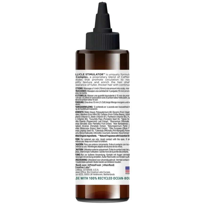 Hair ResQ Follicle Stimulator Serum er et serum utviklet for tynnende hår, unikt formulert med CBP Tri-Complex, en proprietær blanding av plantebaserte peptider, biotin og koffein. Klinisk testede peptider retter seg mot DHT, som er en årsak til begynnende hårtap, mens biotin og koffein forbedrer sirkulasjonen for å nære hårsekkene. Dette styrker teksturen og beriker hårstråene, noe som gir inntrykk av tykkere og fyldigere hår ved kontinuerlig bruk.