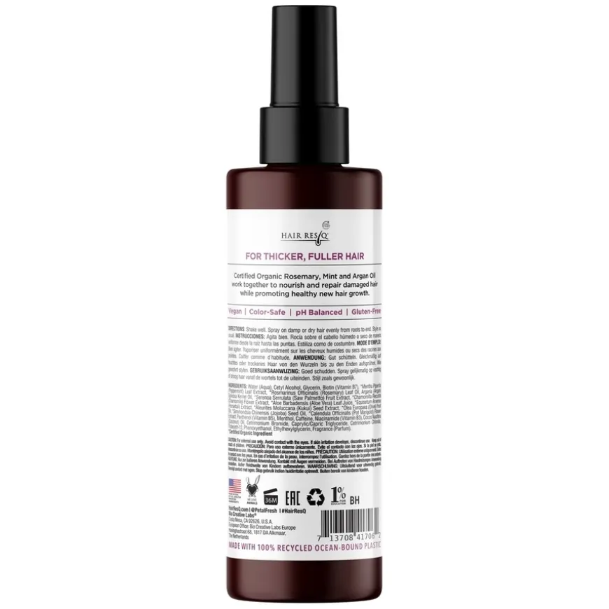 Hair ResQ Thickening + Damage Repair Treatment Spray er en naturlig spray utviklet for tynnende hår. Formulert med biotin for å styrke og revitalisere håret, samt koffein for å energisere og stimulere hårsekkene for å fremme sunn hårvekst. Sertifisert økologisk rosmarin og mynte arbeider sammen for å nære og reparere skadet hår, samtidig som de støtter sunn ny hårvekst. Produktet er vegansk, og emballasjen er laget av 100 % resirkulert Ocean Bound Plastic.