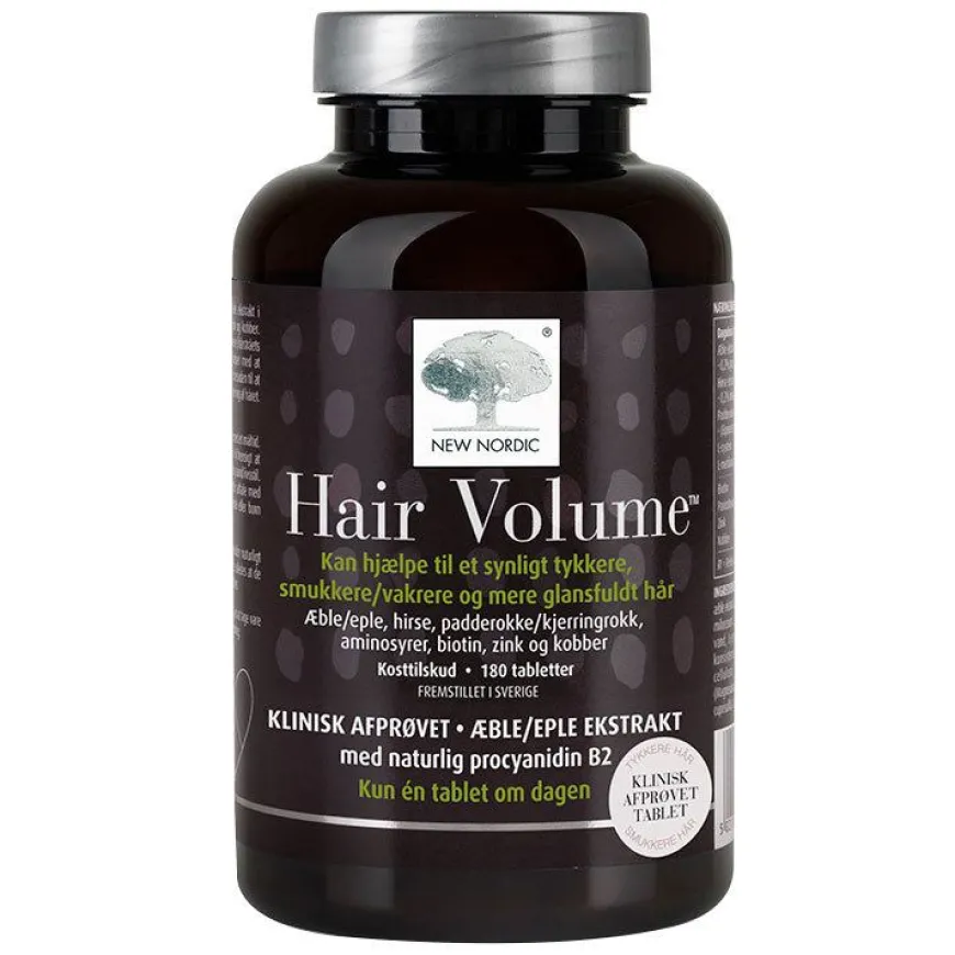 Hair Volume™ er en klinisk dokumentert hårtablett som kan gi synlig tykkere, vakrere og mere glansfullt hår. Tabletten er basert på epleekstrakt i kombinasjon med hirse, kjerringrokk, aminosyrer, biotin, sink og kobber. Tablettene tilfører næringsstoffer til hodebunnen og hårsekken hvor håret dannes. Innholdet av sink og biotin kan bidra til å opprettholde normalt hår og en normal hud. Sink kan også bidra til å vedlikeholde normale negler, mens kobber bidrar til en normal pigmentering av håret.