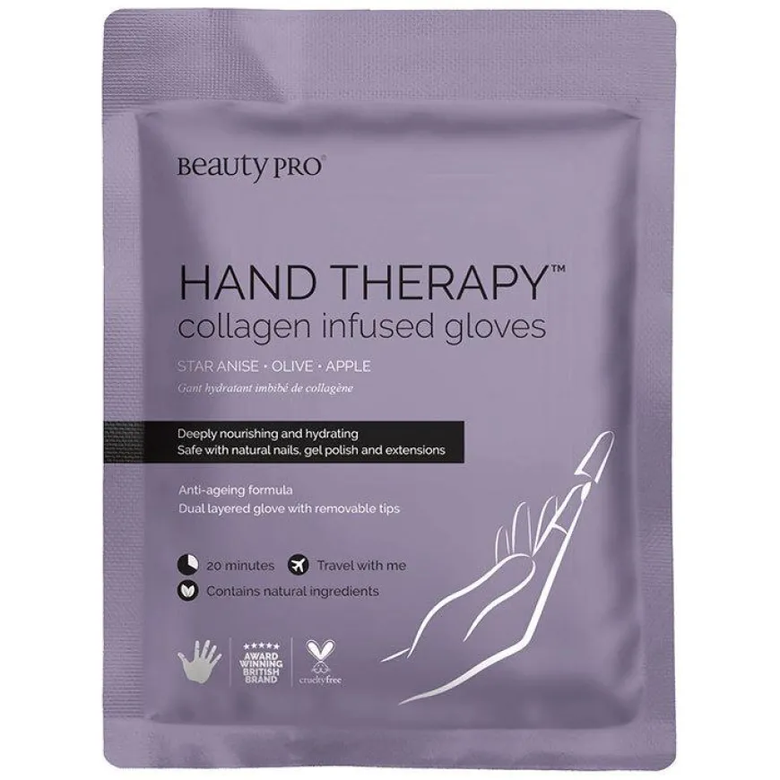Hand Theraphy Collagen Infused Gloves er endypt nærende og fuktighetsgivende behandling som er perfekt for dine hender. BeautyPro Hand Therapy vil la hendene føles silkemyke, samtidig som den gir en anti-aldringsbehandling.Håndmasken er en tolags anti-aldringsbehandlingshanske kombinert med kollagen og fruktekstrakter for å nære og fukte hendene dypt. De avtakbare fingertuppene gjør det enkelt å jobbe med neglene eller fortsette med daglige aktiviteter.
