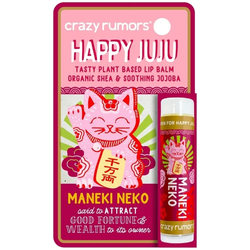 Crazy Rumors Lip Balm er en leppepomade inspirert fra hele verden, hvor den vinkende katten fra Japan inviterer til gode stunder. Det sies at den bringer lykke og rikdom til sin eier. Oppdag de japanske smakene av lychee og kirsebærblomst. Crazy Rumors leppepomader er 100 % naturlige og veganske, de både lukter og smaker fantastisk! De inneholder fuktighetsgivende sheasmør som gir næring og beskytter tørre lepper. Gir langvarig fuktighet og gjør leppene dine fantastisk myke. I tillegg er de smaksatt med naturlige smaker og eteriske oljer, samt søtet med litt naturlig stevia.