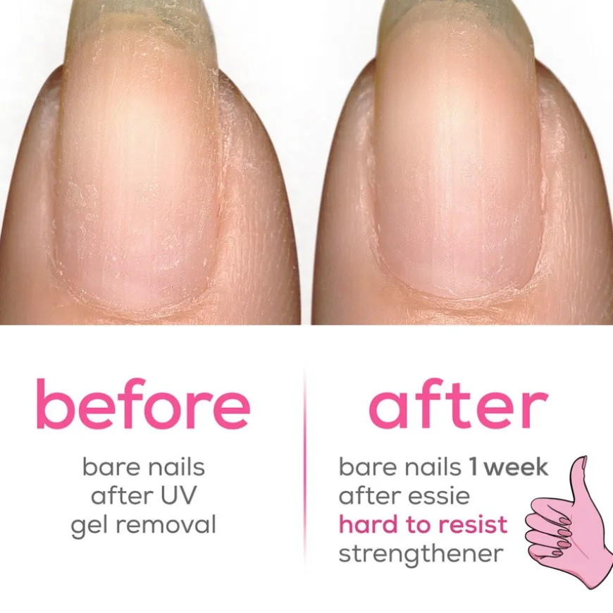 Styrk neglene med en pleiende negleforsterker. essie hard to resist pink Glow & Shine hjelper til med å låse inn fuktighet og dermed styrke neglene og øke deres fleksibilitet. Forbedrer neglens motstand og gir en rosa farge. 96 % mente at neglene umiddelbart føltes bedre beskyttet*. For best resultat: Påfør to lag med negleforsterkeren på ulakkerte negler. La virke i tre dager og fjern deretter med en mild neglelakkfjerner. Nyt sunne, sterke negler med essie!