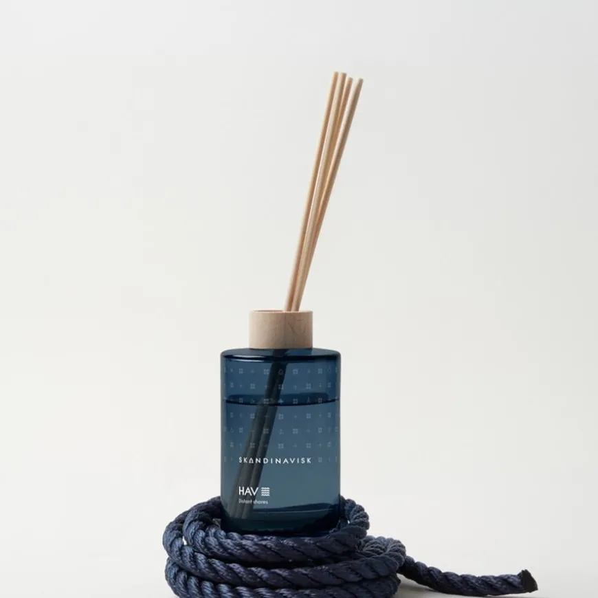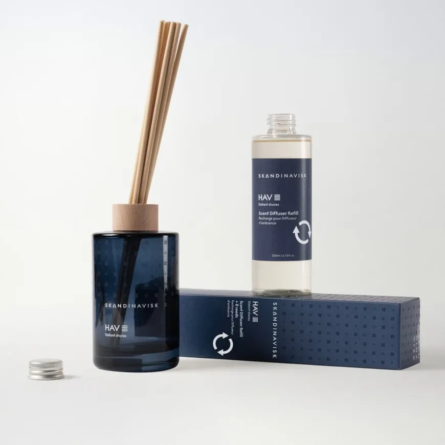 Skandinavisk HAV Scent Diffuser kombinerer skandinaviske duftfortellinger med vegetabilske oljer fra fornybare kilder, fylt i en malt glassvase. Den har en dekorativ FSC-sertifisert bøketre-ring og åtte høyytelsespinner som gir en skånsom og bærekraftig romduft i opptil 3 måneder.