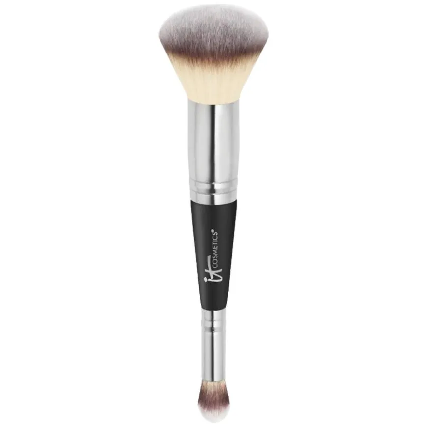 IT Cosmetics bestselgerbørste, Heavenly Luxe Complexion Perfection Brush # 7, er en 2-i-1 sminkebørste som følger ansiktets konturer og lar deg påføre et elegant, ensartet lag med foundation eller concealer.