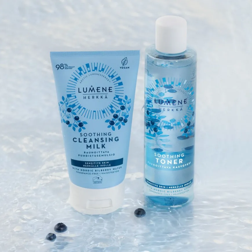 Herkkä Soothing Cleansing Milk er enlett rensende melk beriket med blåbærvann og arktisk kildevann som forsiktig fjerner sminke og urenheter uten å irritere sensitiv hud. Den nærende teksturen beroliger huden og gir den næring slik at den føles rolig, balansert og fuktig. Sammensetningen er parfymefri og er utviklet i samarbeid med Allergi-, hud- og astmaforbundet i Finland. Passer for sensitiv hud. 100 % vegansk.
