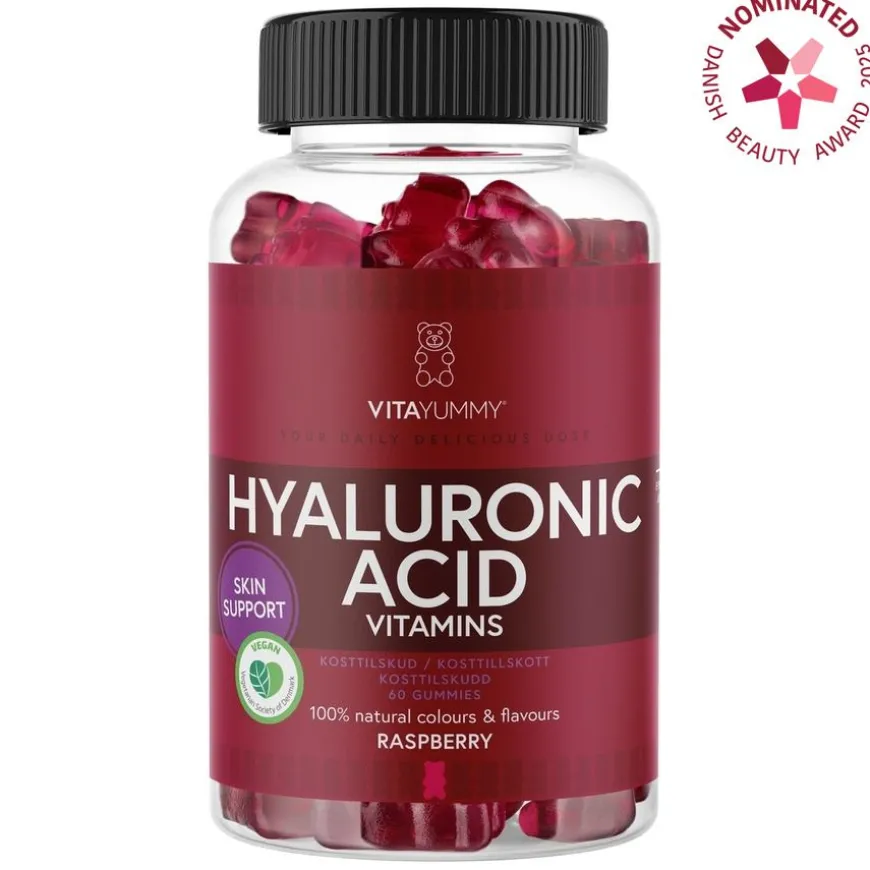 Hyaluronsyre er en ingrediens som ofte finnes i hudpleieprodukter, da den er kjent for sin fuktighetsgivende evne. Hyaluronsyre kan binde vann opptil 1000 ganger sin egen vekt. I tillegg til hyaluronsyre inneholder VitaYummy Hyaluronsyre også niacin, som bidrar til å opprettholde normal hud og normale slimhinner.