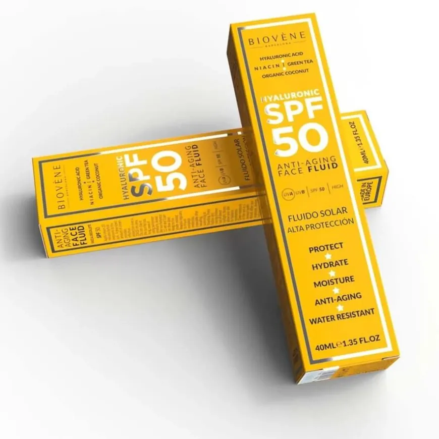 Hyaluronic Anti-Aging Face Fluid SPF50 er et ultralett solbeskyttende ansiktsfluid som kombinerer høy UVA/UVB-beskyttelse med fuktighetsgivende og anti-aldrende ingredienser. Formulert med hyaluronsyre, niacinamide og økologisk kokosnøttekstrakt, beskytter den huden effektivt mot solskader og tidlige aldringstegn. Den hurtigabsorberende og vannresistente formelen passer perfekt til ansikt og hals, og etterlater huden hydrert og beskyttet – uten å føles fet. Egnet for alle hudtyper.