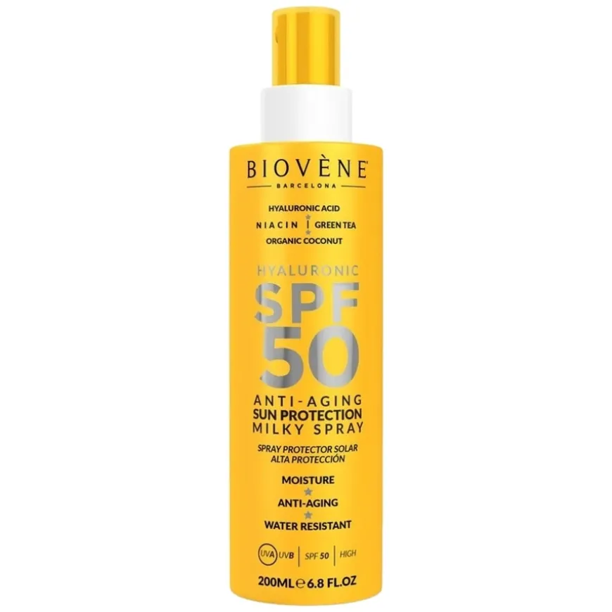 Hyaluronic Anti-Aging Sun Protection Milky Spray SPF50 er en ultralett solkrem i sprayform med høy solfaktor og bredspektret UVA- og UVB-beskyttelse. Den inneholder fuktighetsgivende hyaluronsyre, utjevnende niacinamide og økologisk kokosnøttekstrakt for å beskytte huden mot dehydrering, pigmentflekker og tidlige aldringstegn. Den absorberes raskt, føles ikke fet, og er vannresistent – ideell til bruk på kroppen og i ansiktet gjennom hele dagen. Passer alle hudtyper.