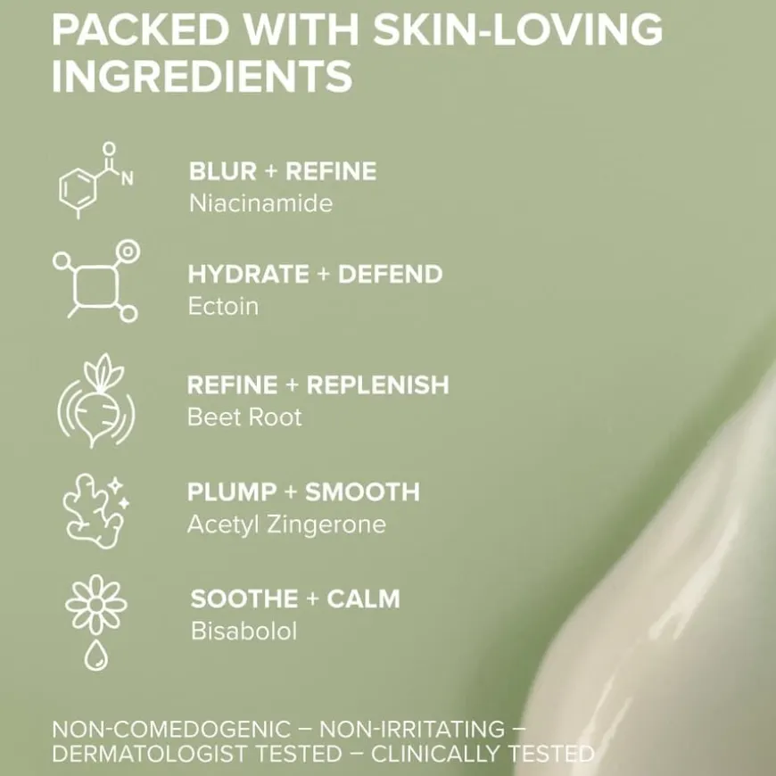 Water/Aqua/Eau, Isododecane, Butyloctyl Salicylate, Polymethylsilsesquioxane, Glycerin, Butylene Glycol, C12-15 Alkyl Benzoate, Niacinamide, Fructooligosaccharides, Beta Vulgaris (Beet) Root Extract, Sodium Polyacryloyldimethyl Taurate, Gluconolactone, Argania Spinosa Kernel Oil, Acetyl Zingerone, Fragrance, Tocopherol, Tocopheryl Acetate, Acetyl Glucosamine, Ectoin, Acrylates/C10-30 Alkyl Acrylate Crosspolymer, Bisabolol, Sodium Benzoate, Potassium Hydroxide, Potassium Lactate, Sodium Dilauramidoglutamide Lysine, Lactic Acid, Calcium Gluconate, Geraniol, Linalool