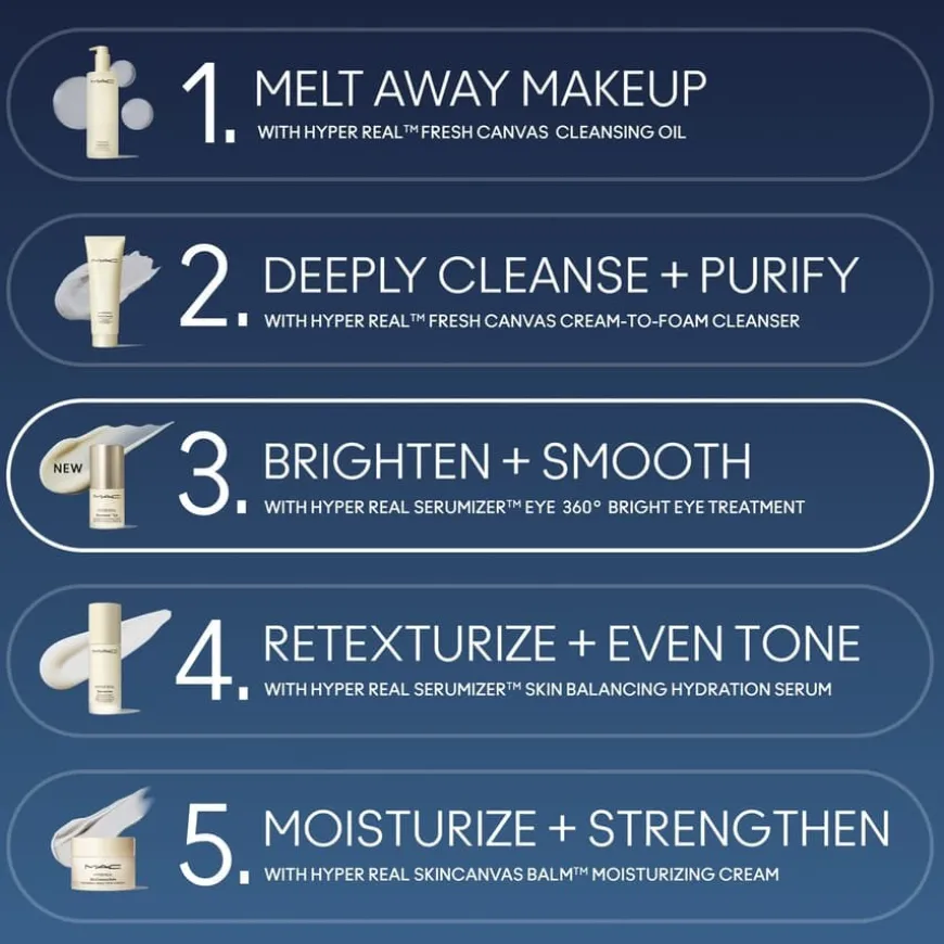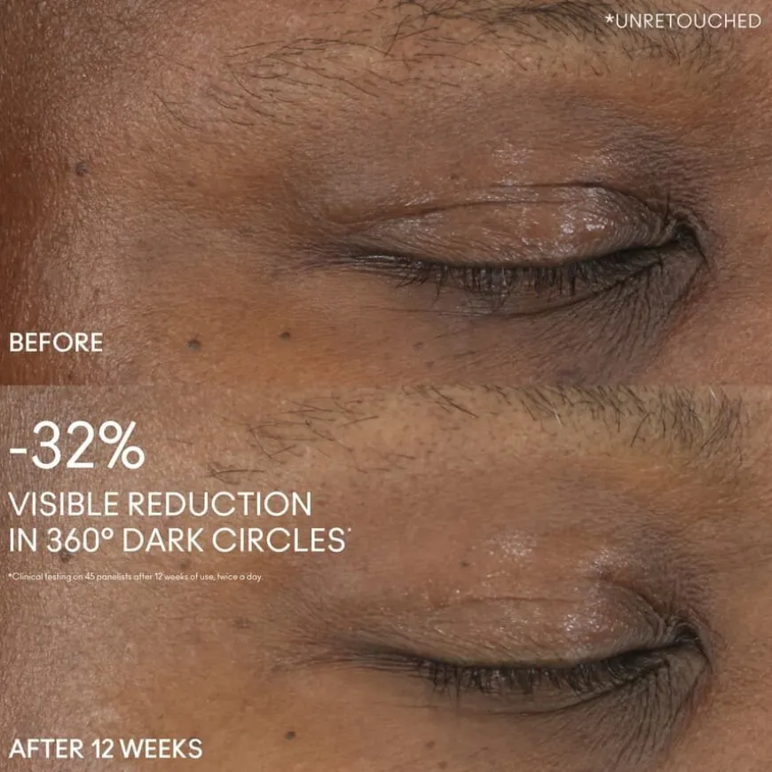 Hyper Real Serumiser 360 Bright Eye Treatment fra MAC er en glødgivende øyebehandling som synlig reduserer mørke rander under øynene. Den fuktighetsgivende og oppstrammende formelen gir huden glød, samtidig som den glatter ut og jevner ut huden. Formelen er basert på en potent blanding av ingredienser, blant annet japansk pionekstrakt, vitamin C og niacinamid, som jevner ut hudtonen og gjør huden lysere, mens et utjevnende peptid øker hudens elastisitet. I tillegg gir hyaluronsyre øyeblikkelig og langvarig fuktighet, mens ceramider bidrar til å styrke hudbarrieren. Øyekuren absorberes raskt og er utviklet for å fremheve og holde på makeup gjennom hele dagen.