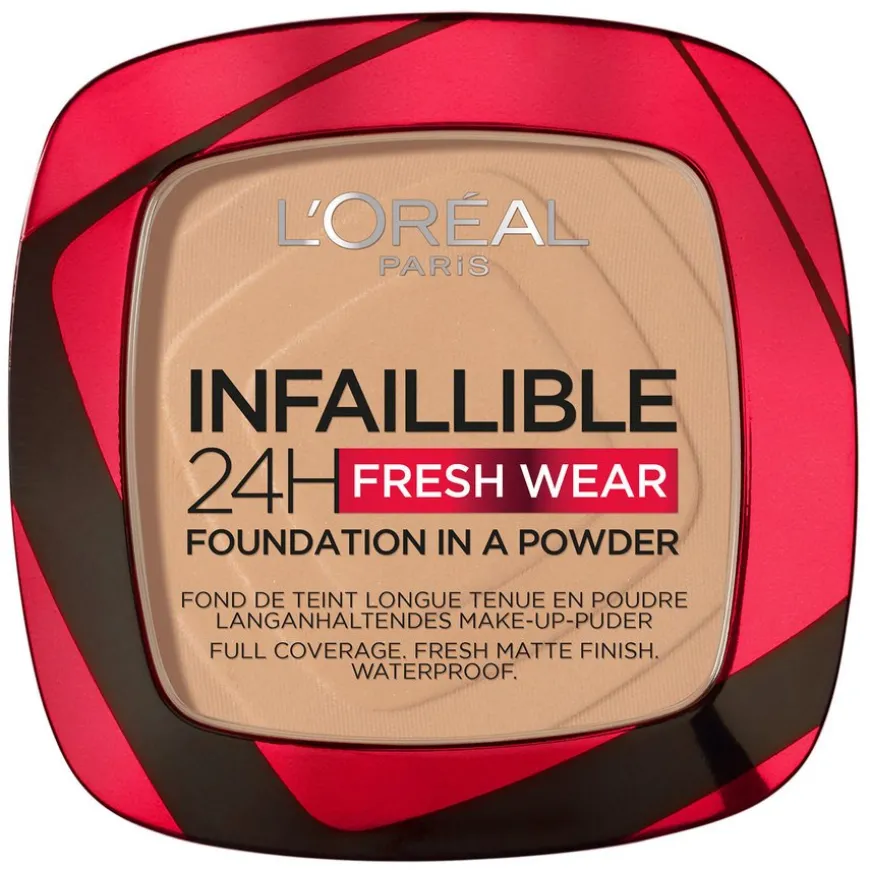 Oppdag Infaillible 24H Fresh Wear Foundation In A Powder fra L’Oréal Paris. Denne pudderfoundationen dekker og matter som en flytende foundation samtidg som den matter ned huden uten å «kake» seg. Dette er mer enn bare et pudder! Beriket med fine selvklebende pigmenter som fester seg til huden for å vare hele dagen. Det er lett å tone ut og gir huden din en naturlig, sømløs, fløyelsmyk matt finish. Tilgjengelig i flere nyanser for å passe til forskjellige hudtoner.