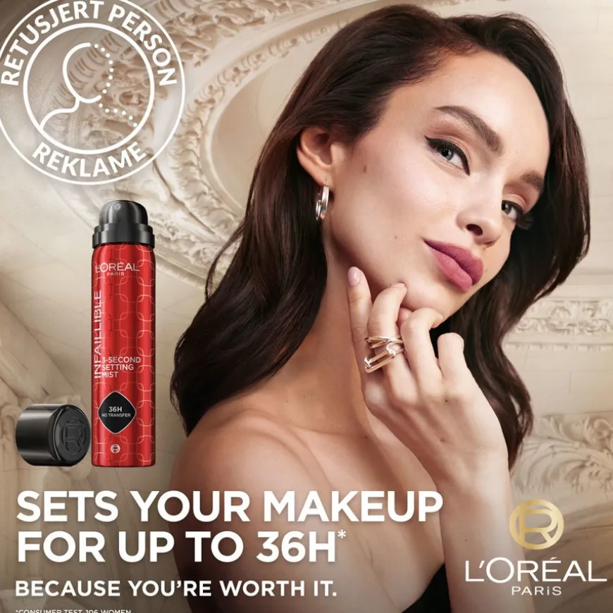 L’Oréal Paris Infaillible 3-Second Setting Mist er en fikseringsspray som sørger for at makeupen ikke smitter av. Sprayen sikrer at makeupen blir sittende i opptil 36 timer*. Formelen er vannfast, svetteresistent og smitter ikke av på klærne! Mikrodiffuser-system: Føles lett som fjær, kleber ikke, lager ikke merker eller ødelegger makeupen. Gir en silkemyk finish.