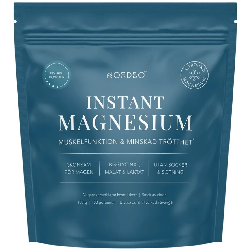 NORDBO Instant Magnesium er et allsidig magnesiumtilskudd i form av hurtigvirkende pulver. Pulveret består av tre former av magnesium: magnesiumbisglycinat (83%), magnesiummalat og magnesiumlaktat. Alle har høy biotilgjengelighet og er skånsomme for magen.
