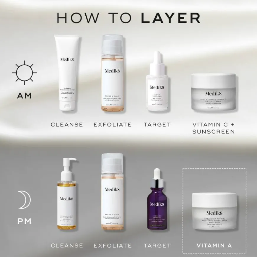 - Time Release-teknologi: Medik8 har utviklet ulike systemer for gradvis frigjøring som kapsler inn det aktive stoffet. Systemene frigjør A-vitaminet gradvis og i langsom takt for at huden ikke skal få sjokk, og for å minimere irritasjon. Time Release-teknologien har dessuten en ekstra fordel gjennom at A-vitaminet beskyttes mot omgivelsene, noe som øker stabiliteten over tid. Alle Medik8 sine A-vitaminprodukter har ulike innkapslingssystemer, som alle gir redusert hudirritasjon og økt stabilitet.