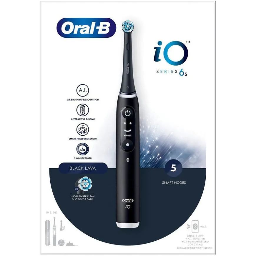 Oral-B iO 6 elektriske tannbørste benytter kraftige, men likevel skånsomme mikrovibrasjoner med et unikt tannlegeinspirert rundt børstehode for å gi en profesjonell ren følelse hver dag. Den smarte trykkontrollen hjelper deg slik at du verken pusser for hardt eller for svakt, for å gi en bedre beskyttelse av tannkjøttet og oppnå den beste rengjøringen. Kunstig intelligens (AI) gjenkjenner pussestilen din og veileder deg for enda bedre tannpussing hver dag. Bytt ut Oral-B iO børstehodet hver 3. måned for best mulig resultat. Utover det rent teknologiske fremskrittet ved å innlemme industridesign av verdensklasse har Oreal-B muliggjort den mest nøyaktige, skånsomme og lydløse tannpussen du har opplevd. I tillegg til å designe et objekt som vekker genuin interesse har Oreal-B skapet et elegant utseende reservert for den mest ettertraktede teknologien. Selve rengjøringen blir selvfølgelig også bedre når du oppgraderer fra manuell til elektrisk tannbørste. Men når du går fra en elektrisk tannbørste til en iO, går du forbi det ordinære til en sann ekstraordinær opplevelse, som du vil se, høre og føle er annerledes.