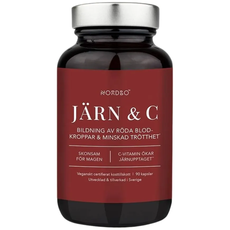NORDBO Jern & C er et skånsomt jerntilskudd med jernbisglycinat og syreneutral C-vitamin av kalsiumaskorbat. Jernbisglycinat har høy biotilgjengelighet og er samtidig skånsom for magen, takket være at jernet er bundet til aminosyren glysin.